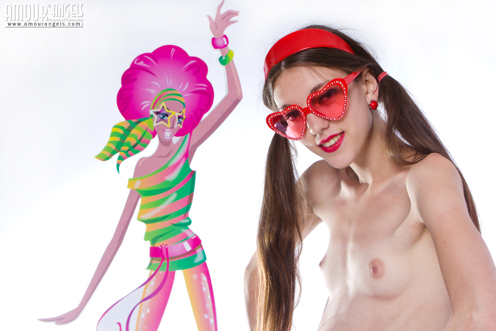 Adorable adult photo images teens free with red glasses in the shape of hearts and a tape recorder taking off her clothes.