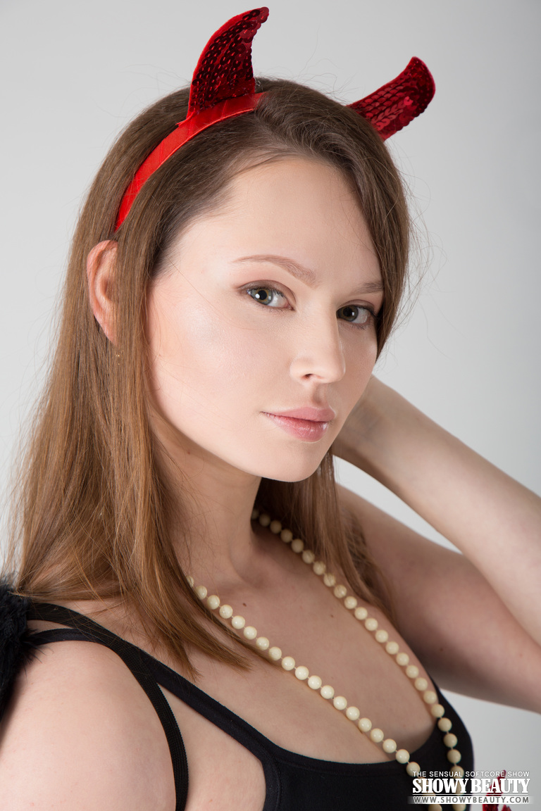A pair of horns beautifully expresses the naughty side of this smoking hot and she shows a lot more than just that.
